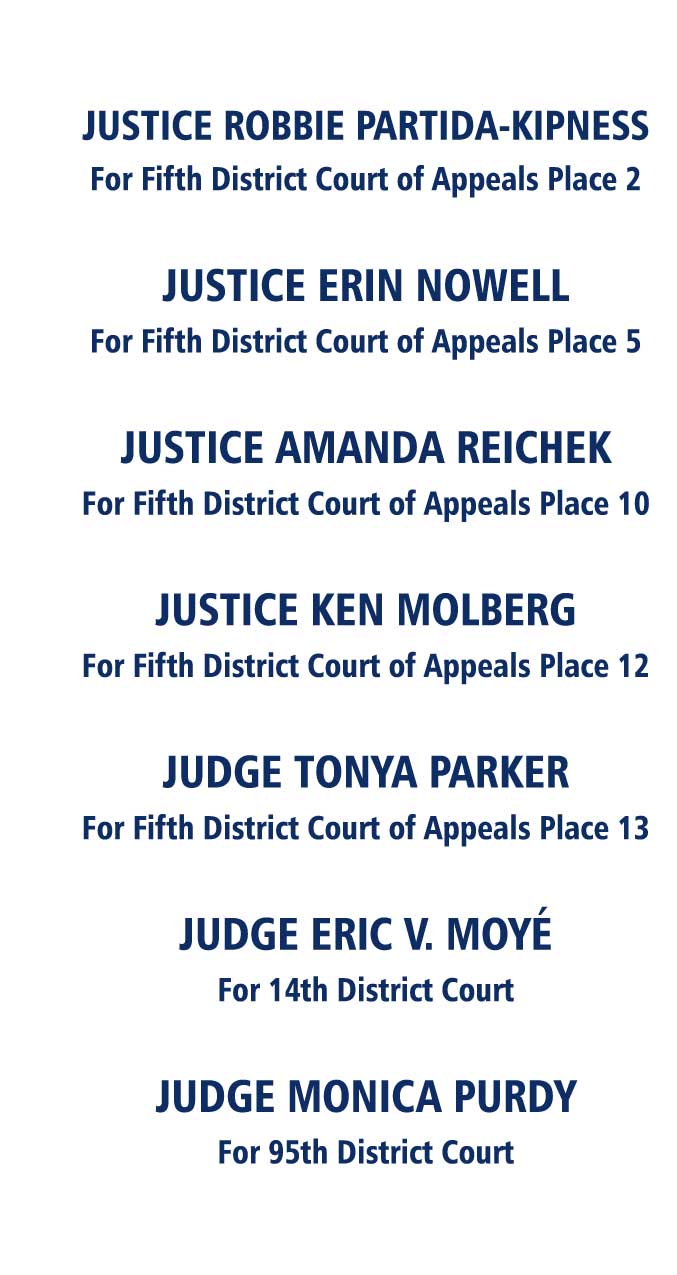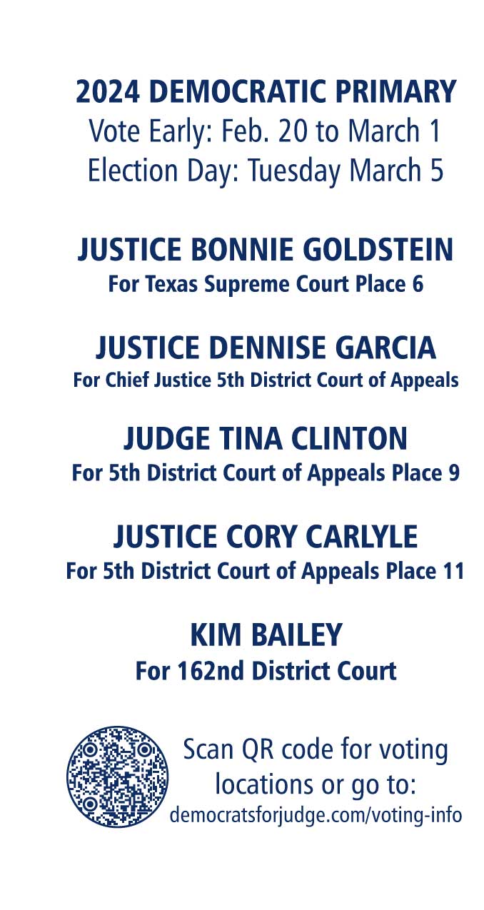 These judges and justices serve on the 5th District Court of Appeals and district courts in North Texas and are Democrats running for local, regional and statewide judicial positions in 2024. Vote in the Democratic Primary on March 5 and in the general election Nov 5, 2024.